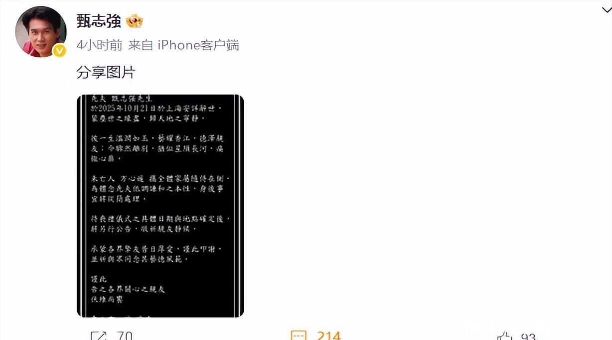 曝甄志强离世不到24小时,私生活“丑闻”被扒,恶心的一幕出现了 刚送走朱媛媛和许绍雄,娱乐圈又传来坏消息,甄志强也走了,才 59 岁,真是让人心里发堵啊! 他走得太突然了,妻子方心媛说他是 21 号离世的,可前一天 20 号,他还在社交平台发动态呢。照片里吃了一大堆美食,吃完还啃了点小点心,精神头看着特别足,谁能想到转天就没了呢?有传言说可能是踢球时突发心脏病,但家属没说具体原因,咱也不好瞎猜。对了,他之前还有 “最帅展昭” 的称号,演了不少经典角色,为人也一直挺低调的。不过他 20 号发的动态里,右眼眼皮有点外翻,后来有人念叨起 “右眼跳灾” 的老话,虽说没科学依据,可配上这事儿,总让人心里不得劲。他以前说过 “危险在出现前,往往没有预警”,现在想来,这话真是一点没错。